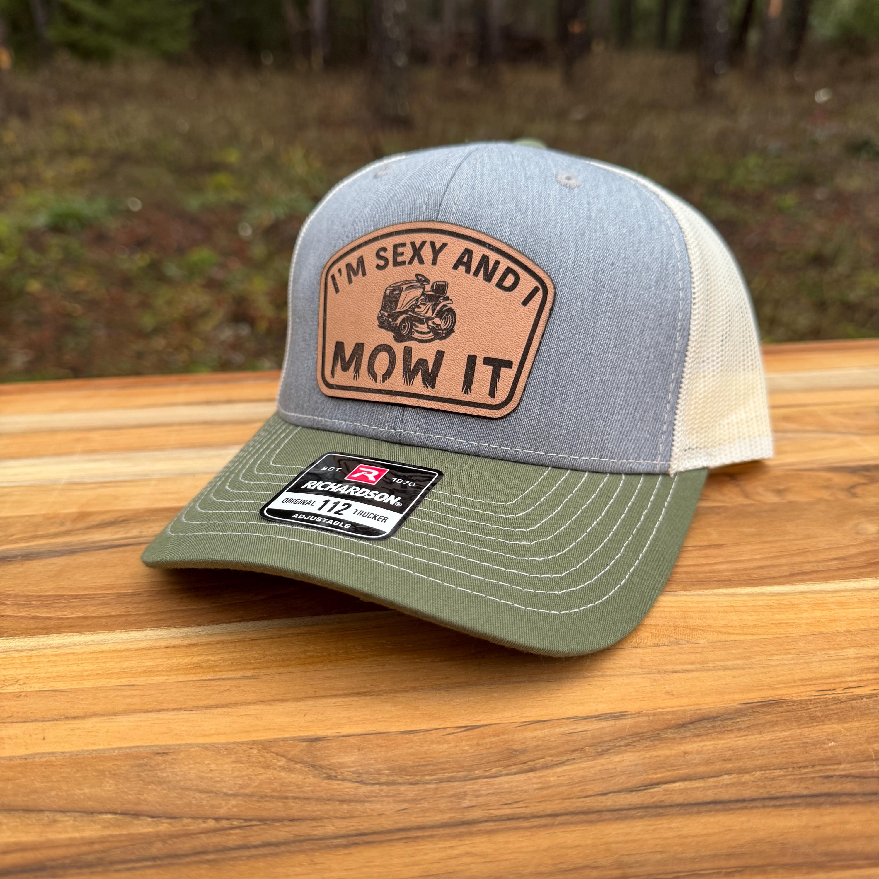 I'm Sexy and I Mow It Leather Patch Hat Trucker Style (Adjustable Snapback)