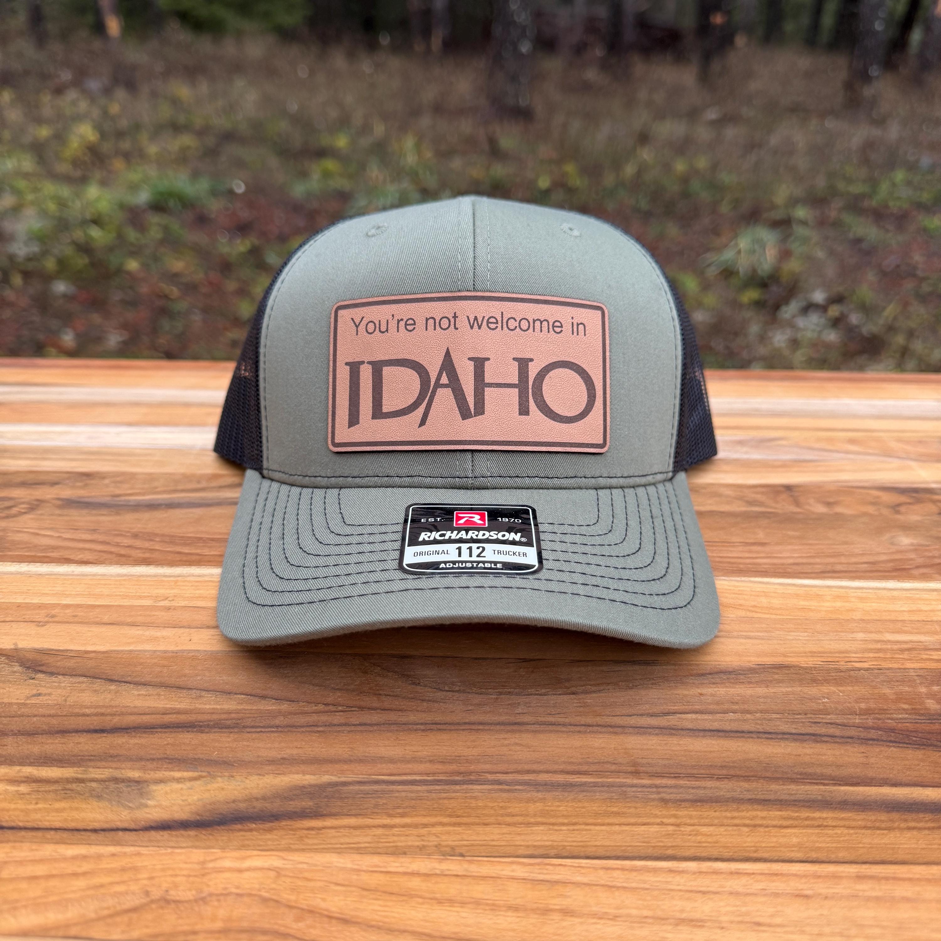 This handcrafted leather patch hat features the bold, tongue-in-cheek phrase “You’re Not Welcome to Idaho,” perfect for locals with a sense of humor and pride in the Gem State. Rugged, clean, and made from high-quality materials, this hat is ideal for Idaho natives who love keeping things lighthearted while repping their home state.